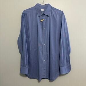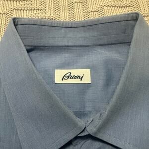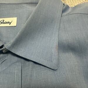 Brioni solid blue long sleeve button down, size 17.5. Recently professionally dry cleaned. Slight mark on the collar, see photos. Previously loved and in excellent used condition. Non smoking and pet free house.