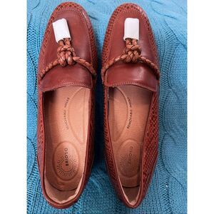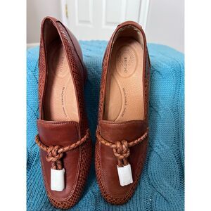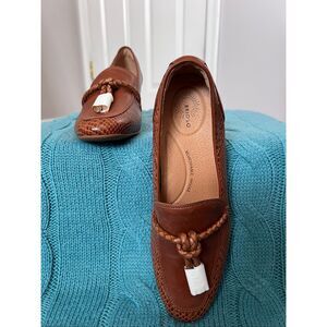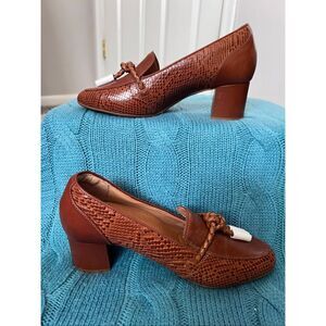 NEW Brioso Frisco Lizard Embossed Leather Loafer. It is a slip-on style loafer with a block heel and a braided detail on the upper, and Tassel fronts w/gold toned caps.