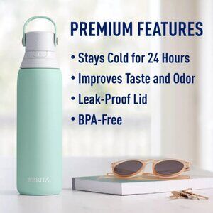 FILTERED WATER DISPENSER: One 20 oz. BPA-free Brita Stainless Steel Water Bottle with one filter, a double-wall insulated bottle that stays cold for a full 24 hours