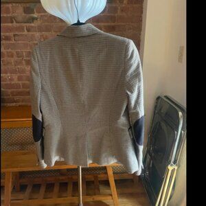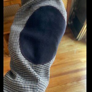 British Khaki women's houndstooth blazer with sued leather elbow patches. Missing one button. Good condition.