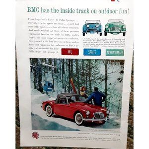 British Motors MG, Sprite and Austin Healey vintage original print ad from 1961. Cut from a 1961 magazine. Measures approx 8X11. Overall good to better vintage condition. Normal wear etc from being vintage. Shows the normal wear/fade etc from being in a old magazine.