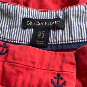 British Khaki Red Harvest Shorts with Navy Anchor Print in Size US 10