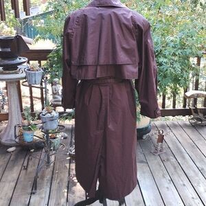 Perfect for now. Warm chocolate brown rain coat. Fabric is rubber lined and has a crisp sheen. Double breasted, rain flaps front and back. Pockets in front. Zip out plaid lining goes down the sleeves. Fully lined when zip out is removed. Repairs made on regular sleeve lining, not the zip out, you'll never see, but they are well done. Size 10P measures 54 at chest, 54 at waist, tie belt here. 56 hips. 47 long from slightly padded shoulder to hem. Stay warm and dry.