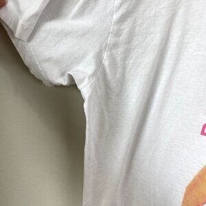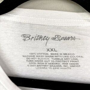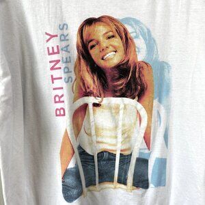 * Features: short sleeves, 100% cotton, crew neck, white background t shirt, large graphic of early 2000s Britney Spears on a chair