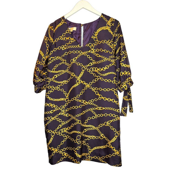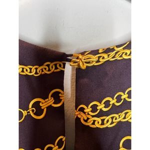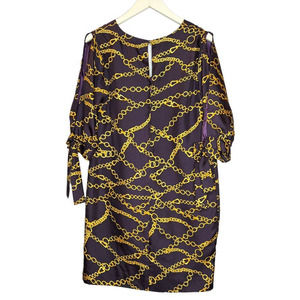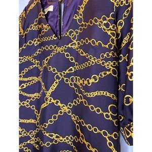 Britt Ryan Dress:100% Silk, Navy with yellow nautical chain design, Sheath, 3/4 Sleeves with tie, Cold Shoulder, gold knot button clasp, knee length, fully lined, size 6
