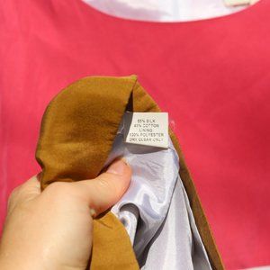 This modern piece gives me very vintage mod vibes. Salmon, white, and a bronze gold color make it feel like something from the 60s, and would be a delight for mid-century modern lovers. The colorblocking in those bold colors makes it a unique and eye catching piece. Silk and cotton blend. In good used condition- no visible flaws. See comments for measurements.