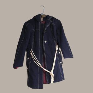 Ruched waist with rope belt ties. Two side pockets. Hood.