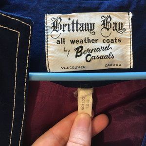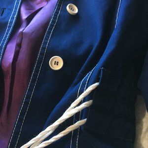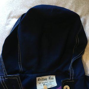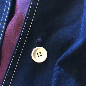 100% Cotton. Pretty blue with white stitching with purple lining.