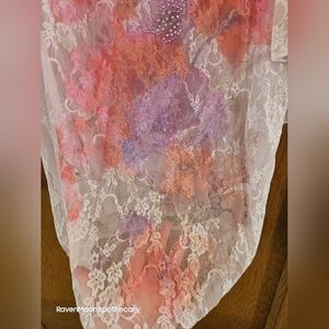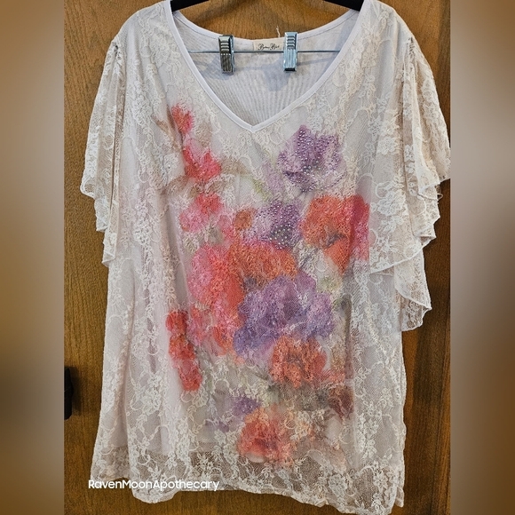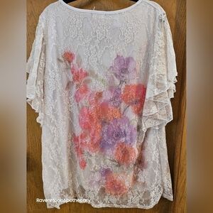 As pictured, the top layer is see thru. Bottom layer is solid with more flower prints. IN the pit to pit picture, the sleeves are kinda layered but the PTP is 23