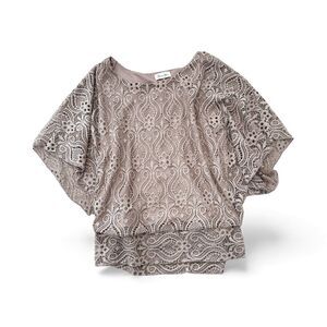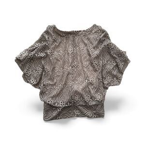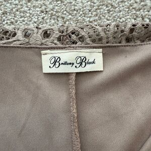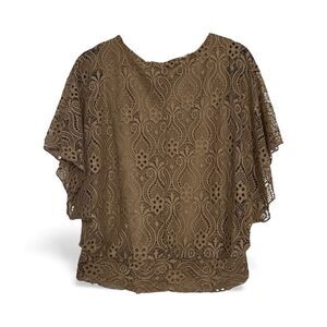 Brittany Black lace overlay tunic top, scoop neck, flutter short sleeves, and banded hem. Color is a brownish color with a touch of pink depending on lighting (see variation in pics). Fabric and size tag missing, however based on measurements and fit, fits like a women's medium.
