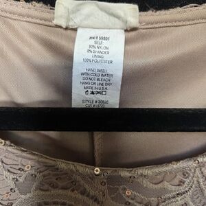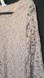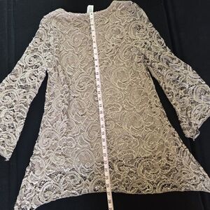 Brittany Black size large 3/4 sleeve with a lace overlay. This is a neutral taupe tan beige shade. scoop neckline and asymmetrical bell sleeves.