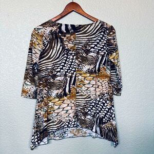 Women’s size Small Brittany Black silver stud bling embellished patchwork leopard zebra snakeskin style animal print brown brown black and teal gray tone stretchy top in excellent preowned condition. Light stretchy material, draped lower hem longer on the sides, 3/4 length sleeves. Clean nonsmoking home. Approx 18” pit to pit, 17” pit to hem side length.