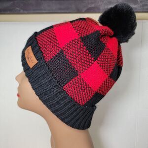 Britt's Knits Buffalo Plaid Faux Fur Pom Hat Red & Black - OSFM NWT, Comes from a smoke free home.