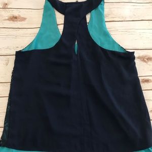 Never worn blue lace tank with twisted crisscross back detail. Fully lined with turquoise material navy blue lace overlay.