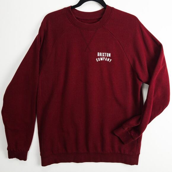 Brixton Company Men’s Crewneck Sweatshirt in a deep red, size Large. Relaxed fit with raglan sleeves, ribbed trim, and soft fleece interior for all-day comfort. Features a clean “Brixton Co.” logo hit on the chest. For a minimalist or skate-inspired wardrobe.