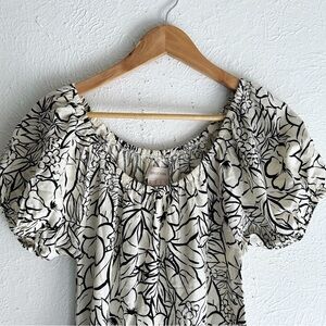 This is an incredibly wearable swing dress with a full, tiered skirt. It’s made with a breathable linen blend that can be tossed on and taken out. Finished with soft details like puff sleeves, elasticized hems and scoop neck in the front and back. On-seam side pockets. Black floral print on ivory