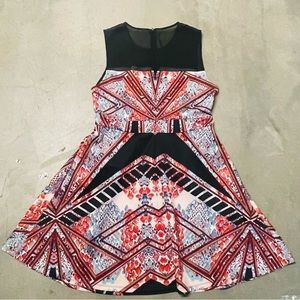 Beautiful lace/netting covers shoulders into a 95% poly 5% spandex form fitting to flowing dress