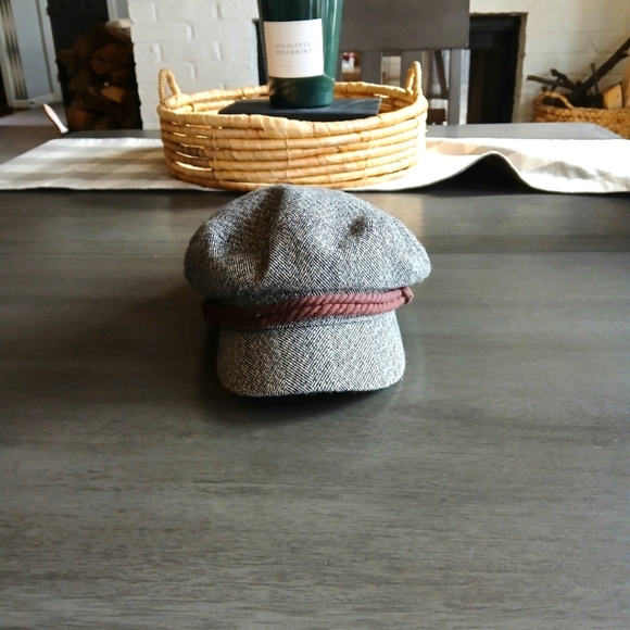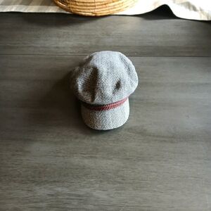 Stylish gray tweed newsboy cap. Features a red band accent. Perfect for casual wear.