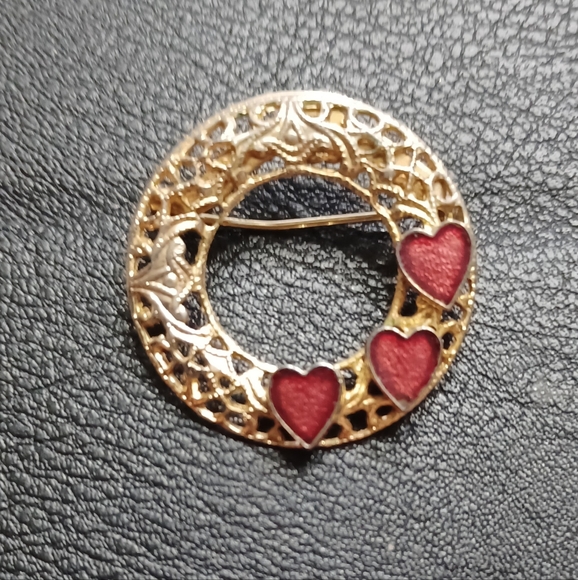 Round gold color brooch with red hearts. it is 1 1/8" across.