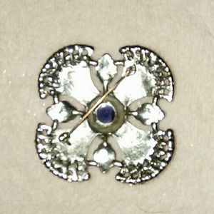 Lavender and dark purple broach. The shape reminds me of a four leaf clover. The back is silver.