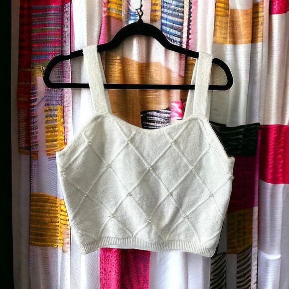 Such a unique piece. This crop tank top is a wool blend sweater knit. It has cute little embellished pears on it. It has no stains, holes or rips. There is slight "pilling" for lack of a better term from the wool blend, but this is to be expected. Soft off white color. True to size.