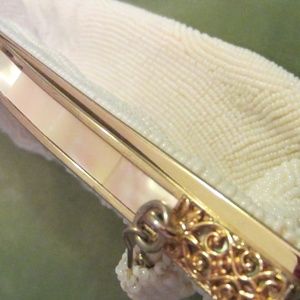 Elaborated shiny beaded purse, mother of pearl brass border closure. a gorgeous handbag, Exclusive of Broadway department store. Excellent, floral front. 6" x 8" with 10 inches strap, hand crafted beads. Sewn fabric label on silk lined pocket. vintage wonderful!