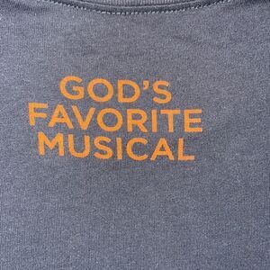 in excellent preloved condition. “god’s favorite musical” detail on back. a few subtle discolored spots due to ages. please see all pics for imperfections.