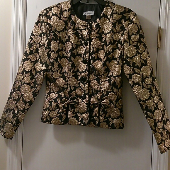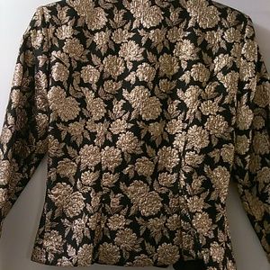 Vintage Black and Gold Brocade Blazer with double bow and splint detail in the front. Size 6.