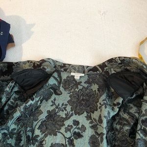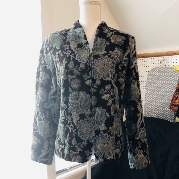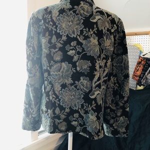 Color: dark brown background with multi blue, beige and green flowers and leaves