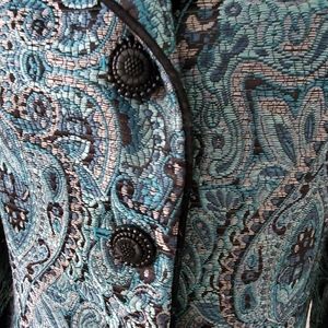 Brocade Jacket in shades teals, grays and blavk Beautiful paisley design. Color has black piping and three black buttons down the front. Princess seaming makes this jacket fit like a dream. Fully lined. True to size, 6.