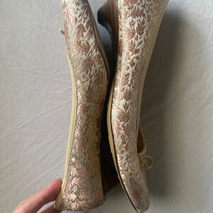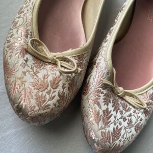 Marie Antoinette style brocade kitten heel ballet flats. Pink and cream with gold embroidered filigree details #marieantoinette