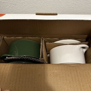 The Brocc Your Body Mini Round Ceramic Cocotte Set includes two mini dutch ovens with handles and lids, one in white and one in green. Each cocotte has a capacity of 18.6 oz and is oven-safe up to 475°F. With a flat-bottomed design and double handles, these cocottes are suitable for use in electric and gas ovens, as well as microwaves. Additionally, they are dishwasher safe, making for easy cleanup after use. The set is brand new in box, ready for use in home cooking and baking.
