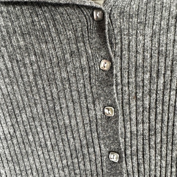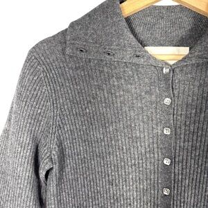 Button front, fine gauge, Merino wool/cashmere blend ribbed knit turtleneck cardigan. Rounded square pearl buttons. Wear buttoned up as a turtleneck or unbuttoned and folded down. Soooo soft!