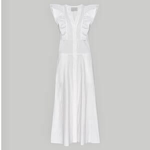 Style tags: Brochu Walker, The Aurora Midi Dress, Ruffle Dress, Cotton Blend Dress, White Midi Dress, Ivory Sundress, Sleeveless Midi, Hidden Button Dress, Pockets Dress, Ruffled Midi, Princess Seam Dress, Banded Waistline, V‑Neck Midi Dress, Day to Night Dress, Resort Dress, Quiet Luxury, Old Money Style, Feminine Chic, Summer Event Dress, Size L Women, Effortless Elegance, Structured Midi