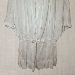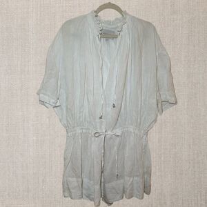 Our St. Tropez Dress was inspired the effortless style of South of France. In an oversized, short, silhouette, this every day, linen dress features short sleeves and a versatile, dropped, elasticized waist. A feminine, embroidered, ruffle collar and a deep vee neckline add romance and the end tips of the self-tie waistband and collar are perfectly finished in vegan leather adding a bit of flare to this casual-chic must-have.