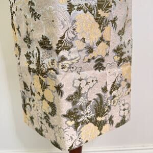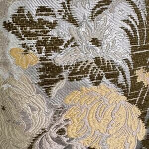 • Color: Pale gold / champagne with olive, silver, and yellow floral motif