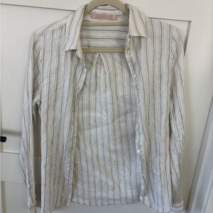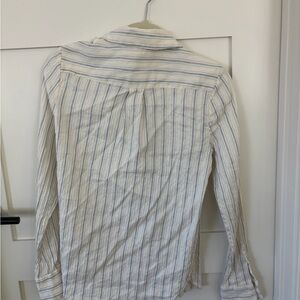 Elevate your wardrobe with this stylish striped button down shirt. Featuring a classic blue and white design, this top is perfect for any occasion. Enjoy the comfort and elegance it brings to your outfit.