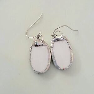 From a very pretty vintage green and white swirled plate that had cracks in it so was doomed for the landfill. I hand cut, polished and lead free soldered these pieces into sweet earrings. They are one inch long by a half inch wide and they come on hypoallergenic ear wires. One of a kind, handmade. I am passionate about vintage china and never use perfect pieces, but always ones with chips or cracks or otherwise unusable.
