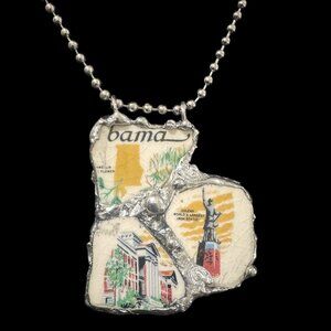 Handcrafted pendant featuring a broken Alabama State commemorative plate set in an artisan metalwork bezel. Unique wearable art perfect for showcasing state pride or as a thoughtful gift.
