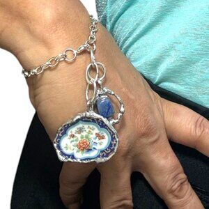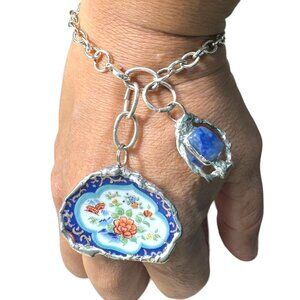 Broken China & Sodalite Charm Bracelet with Artisan Silver-Blend Boho Metalwork