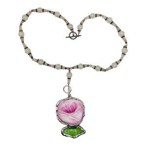 Broken China and Sea Glass Artisan Pendant and Rose Quartz Vintage Necklace