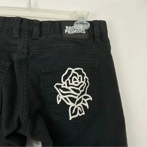 Broken Promises Ultra Slim Black Denim Jeans. Men’s Size 30. Tattoo or graffiti art on the jeans. Distressed look on the knee of the jeans. 99% Cotton, 1% Spandex. No modeling or trades. M2