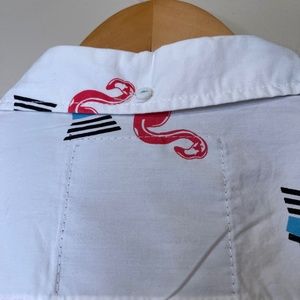 Broken Threads NWOT Flamingo Pattern 80's Novelty Print Save By The Bell Zac Morris Vibes Button Up Collared Single Brest Pocket Short Sleeve Side Slit Summer Pool Party Shirt