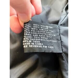 Solid black, mid length down filled quilted winter coat with fur trimmed hood. Hood is removable. Full zip with snap placket.