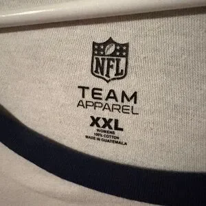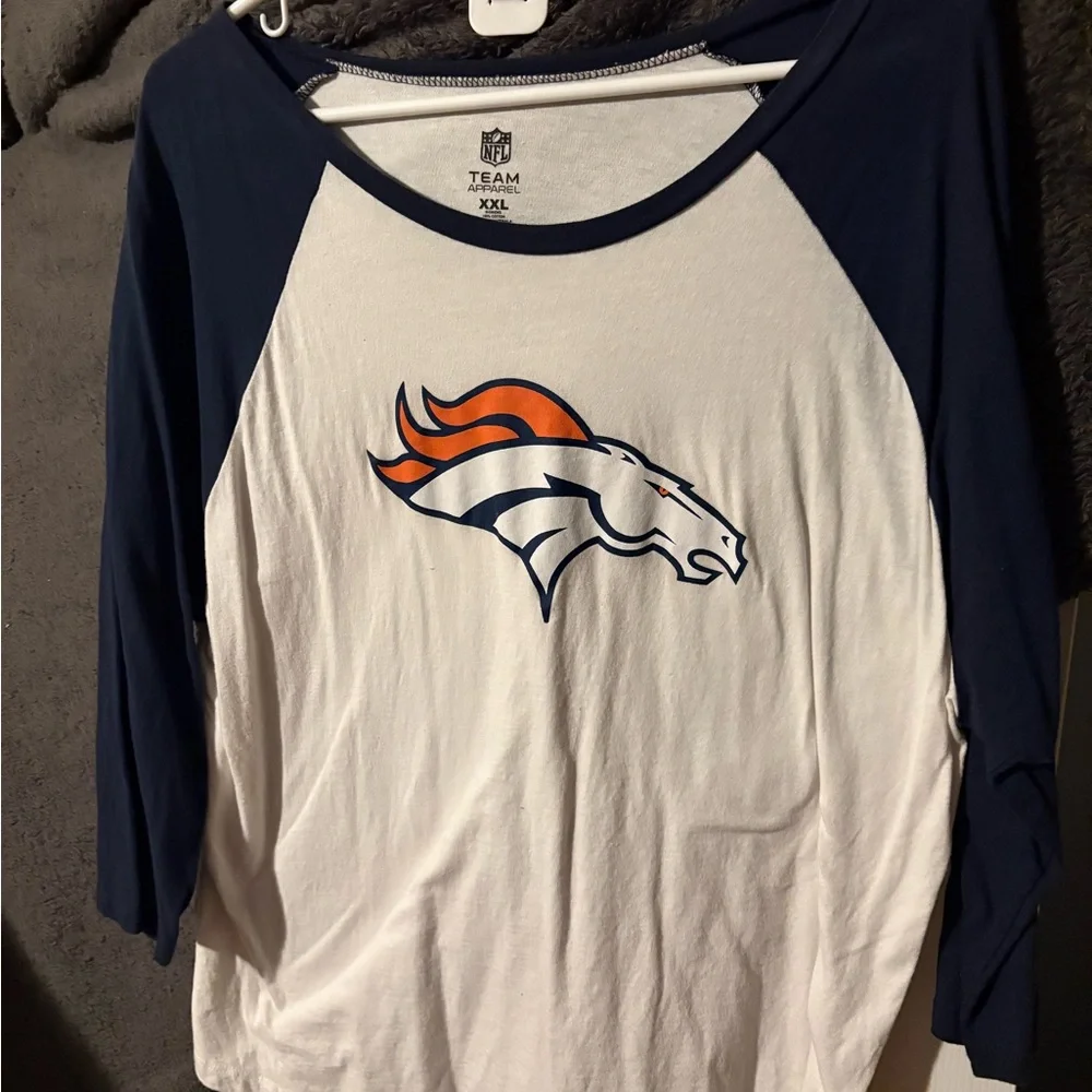 NFL Team raglan shirt with a bold logo. Features navy sleeves and a white body with an orange and blue logo.