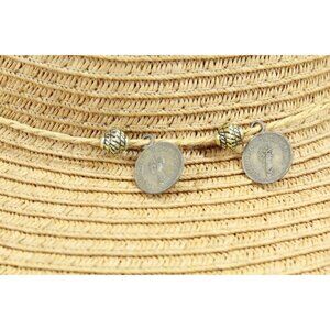 Chic and stylish Broner straw floppy hat in tan, featuring metallic coin detail around the crown. Perfect for dressy summer looks, beach days, or vacation wear.