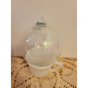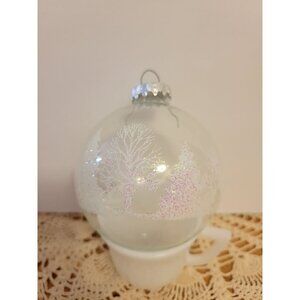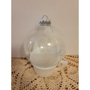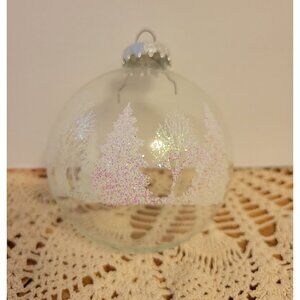 Bronner's Austria holiday hanging ornament. Clear glass with a wraparound light color glitter design depicting a winter holiday landscape. Embossed silver color ring cap. About 4 inches.