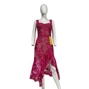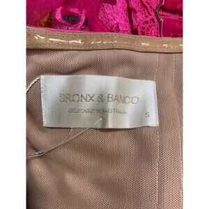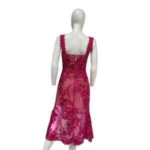 Bronx And Banco 'Eva' Pink Polyester Midi Dress Size S: partially lined, boned bodice with shoulder straps, allover mesh fabric with embroidery throughout, exposed back zipper closure.