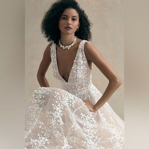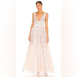 Bronx & Banco WHITE Plunge Megan Floral Embroidered Lace Bridal Gown Size S