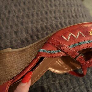 Boho-inspired Bronx red leather wedge sandals, size 37 EU (US 6.5–7).